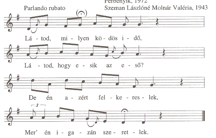 1. Látod milyen ködös idő,Látod, hogy esik az eső?De én azért felkereslek,Mer' én igazán szeretlek.2. A mezei kis pacsirta,Szárnya az...