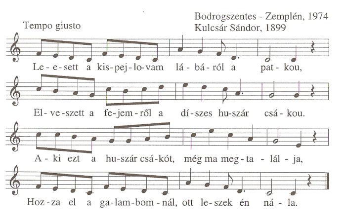 1. Leesett a kis pej lovam lábáról a patkou,Elveszett a fejemről a díszes huszár csákou,Aki ezt a huszárcsákót, még ma...
