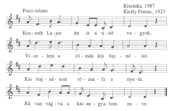 1. Kossuth Lajos, én is a tiéd vagyok,Viselem a rózsás kis bajnétot.Kis bajnétom rózsafa a nyele,Rá van vágva a kisangyalom...