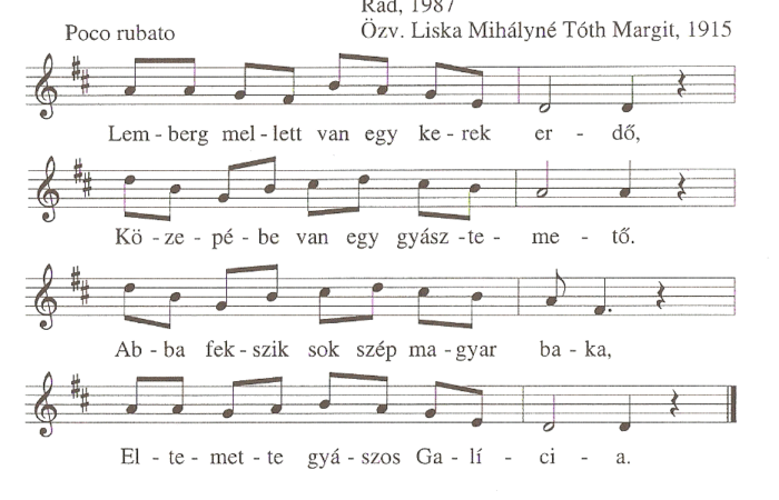 1. Lemberg mellett van egy kerek erdő,Közepébe van egy gyásztemető.Abba fekszik sok szép magyar baka,Eltemette gyászos Galícia.2. Édesanyám kapott egy...