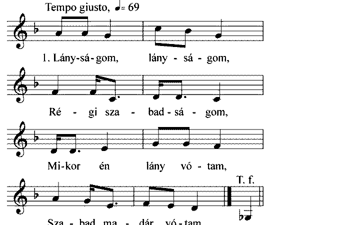 1. Lányságom, lányságom, Régi szabadságom, Mikor én lány vótam, Szabad madár vótam. 2. Adok is, adtam is, Asztalos legénynek, Jó'...