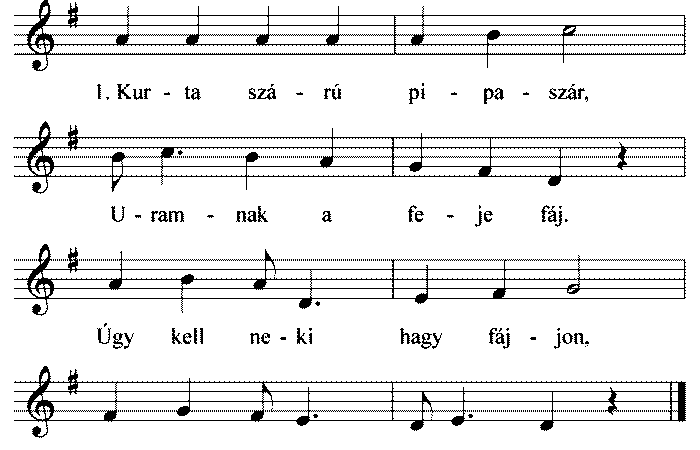 1. Kurta szárú pipaszár, Uramnak a feje fáj. Úgy kell neki hagy fájjon, Lányok után ne járjon. 2. Komám asszony...