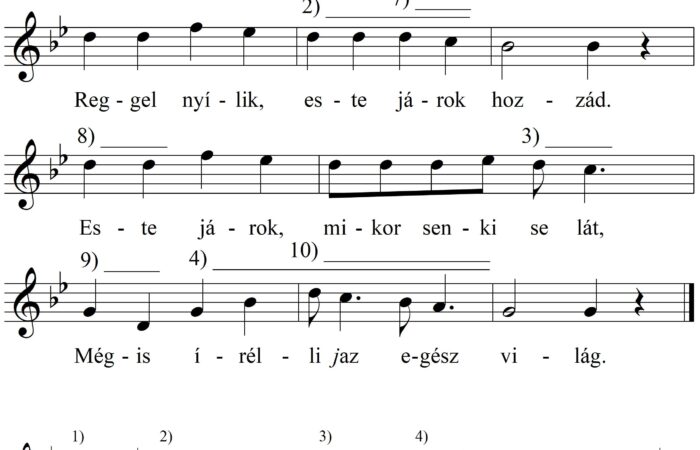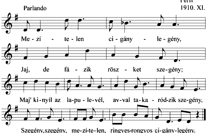 1. Mezítelen cigánylegény, Jaj, de fázik, röszket szegény; Maj’ kinyíl az lapulevél, avval takaródzik szegény, Szegény, szegény, mezítelen, ringyes-rongyos cigánylegény.