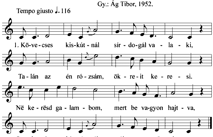1. Kövecses kis kútnál sírdogál valaki, Talán az én rózsám ökreit keresi, Në kerësd galambom, mert be vagyon hajtva, Gyulai...