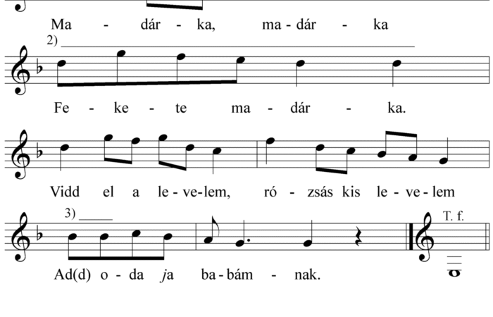 Madárka, madárka, Fekete madárka. Vidd el a levelem, Rózsás kis levelem, Ad(d ) oda ja babámnak.