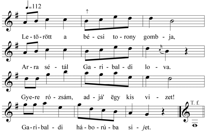Letörött a bécsi torony gombja, Arra sétál Garibaldi lova. Gyere rózsám, adjá‘ ëgy kis vizet! Garibaldi háborúba sijet.