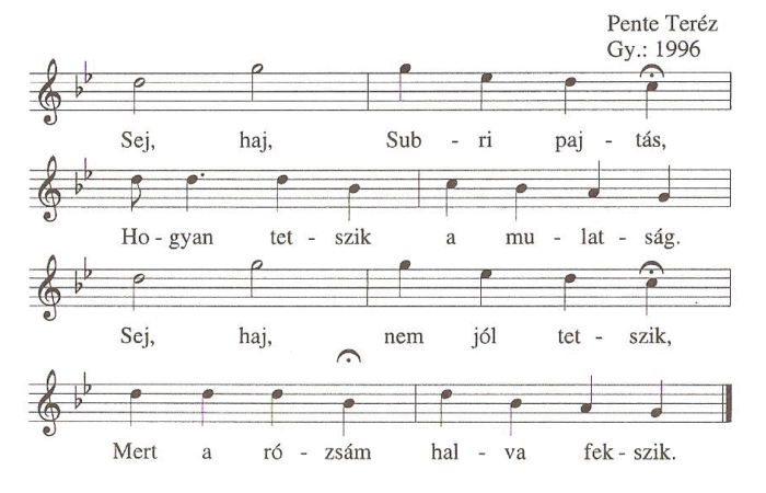 Sej, haj, Subri pajtás,Hogyan tetszik a mulatság.Sej, haj, nem jól tetszik,Mert a rózsám halva fekszik.