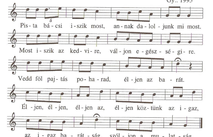 Pista bácsi iszik most, annak daloljunk mi most,Most iszik a kedvire, váljon egészségire.Vedd föl pajtás poharadat, éljen az barát.Éljen, éljen,...