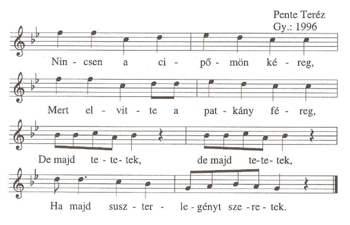 Nincsen a cipőmön kéreg,Mert elvitte a patkány féreg,De majd tetetek, de majd tetetek,Ha majd suszterlegényt szeretek.