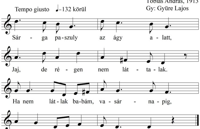 1. Sárga paszuly az ágy alatt,Jaj, de régen nem láttalak.Ha nem látlak babám, vasárnapig,Maghasad a szívem addig.2. Fecském, fecském, édes...