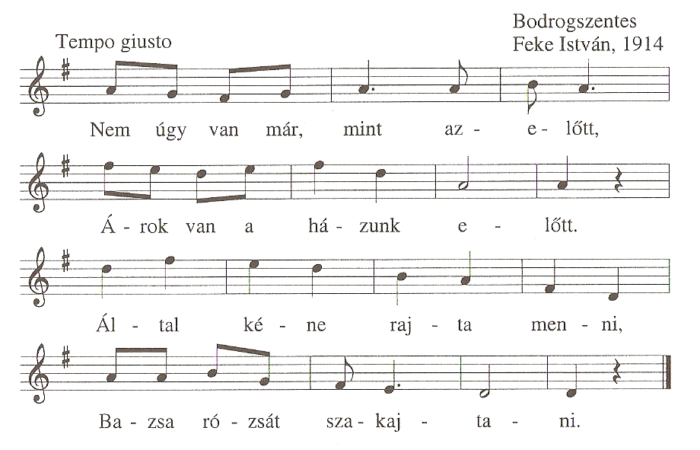 1. Nem úgy van már, mint azelőtt,Árok van  a házunk előtt,Által kéne rajta menni,Bazsarózsát szakajtani.2. Bazsarózsa ne illatozz,Én rám babám,...