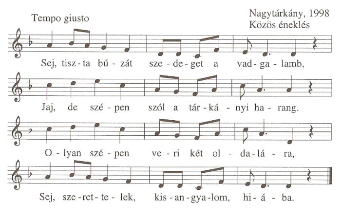 1. Sej, tiszta búzát szedeget a vadgalamb,Jaj, de szépen szól a tárkányi harang.Olyan szépen veri két oldalára,Sej, szerettelek, kisangyalom, hiába.2....