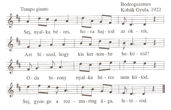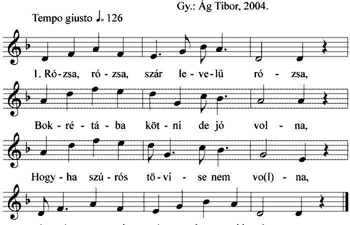 1. Rózsa, rózsa, százlevelű rózsa, Bokrétába kötni de jó volna, Hogyha szúrós tövise nem vo(l)na, A szívemnek százszor könnyebb vóna....