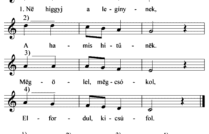 1. Ne higgyj a legínynek, A hamis hitűnek. Megölel, megcsókol, Elfordul, kicsúfol. 2. De hihetsz a lánynak, Mint a gyöngyvirágnak....