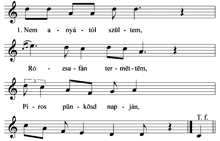 1. Nem anyától születtem, Rózsafán termettem, Piros pünkösd napján, Hajnalban születtem. 2. Mink vagyunk a rúzsák, Mink szeretjük ëgymást. Szép...