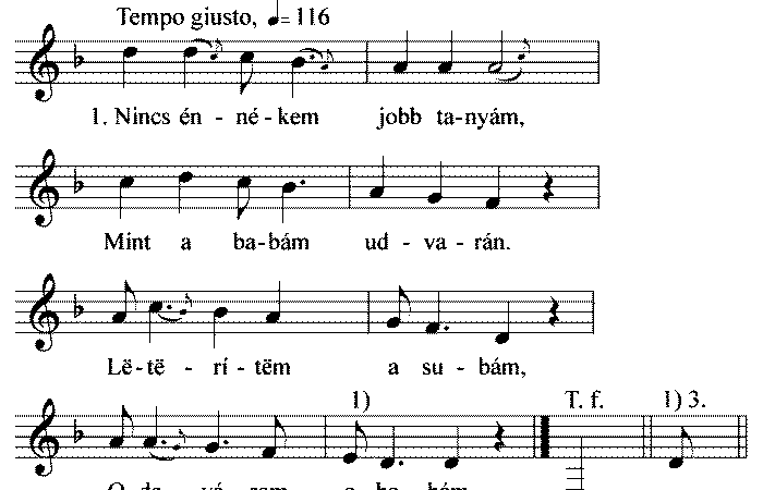 1. Nincs énnékem jobb tanyám, Mint a babám udvarán. Leterítem a subám, Mind a kettő nevet rám. 2. Jaj, én...