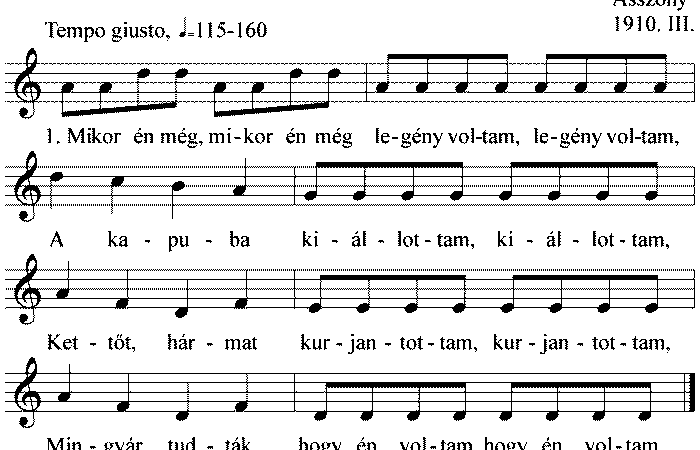 1. Mikor én még, mikor én még legény voltam, legény voltam, A kapuba kiállottam, kiállottam, Kettőt, hármat kurjantottam, kurjantottam, Mingyár...