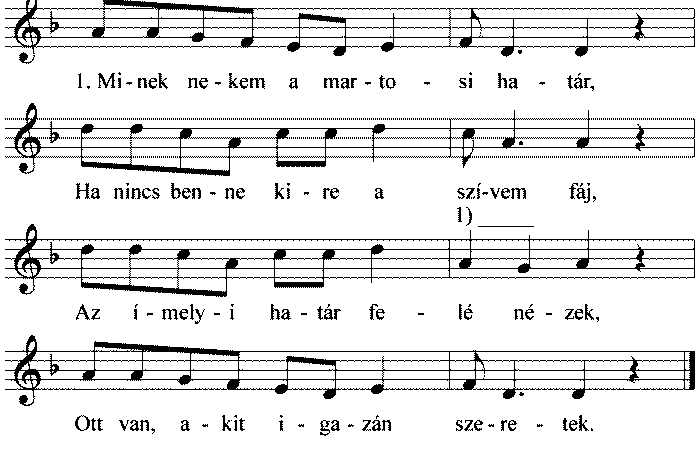 1. Mit ér nékem a martosi határ, Ha nincs benne kire (j)a szívem fáj. Az ímelyi határ felí nízëk, Ott...