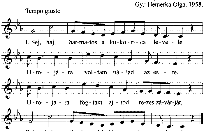 1. Sej, haj, harmatos a kukorica levele, Utoljára voltam nálad az este. Utoljára fogtam ajtód rezes závárját, Sej, haj jó...