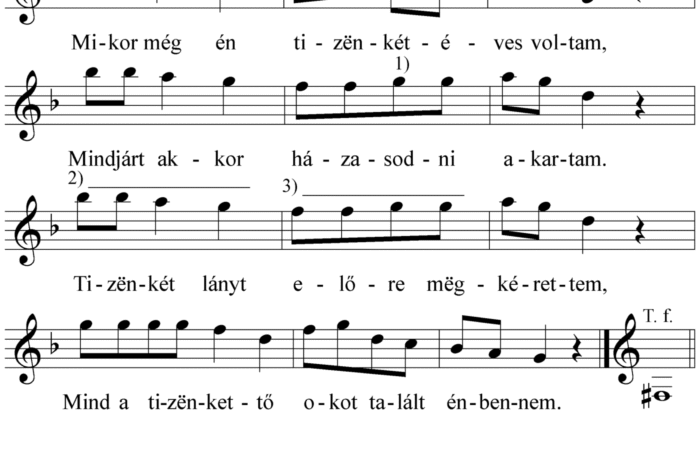 1. Mikor én még tizënkét éves voltam, Mindjárt akkor házasodni akartam. Tizënkét lányt előre mëgkérettem, Mind a tizënkettő okosat talált énbennem....