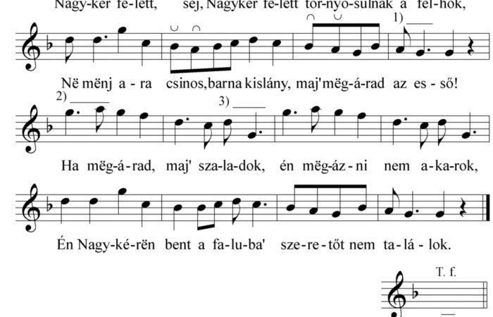 Nagykér fëlëtt, sej, Nagykér fëlëtt, tornyosulnak a felhők, Në mënj arra csinos barna kislány, maj‘ mëgárad az eső! Ha mëgárad, maj‘...