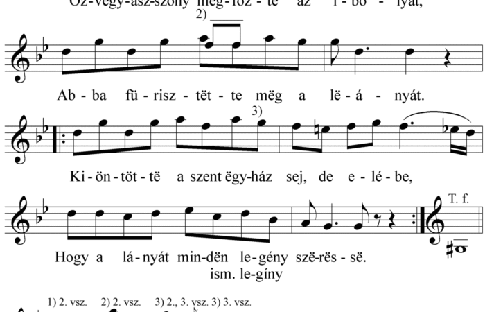 Özvegyasszony mëgfőzte az ibolyát, Abba fürisztëtte mëg a lëányát. Kiöntöttë a szentëgyház, sej, de elébe, Hogy a lányát mindën legény szërëssë.