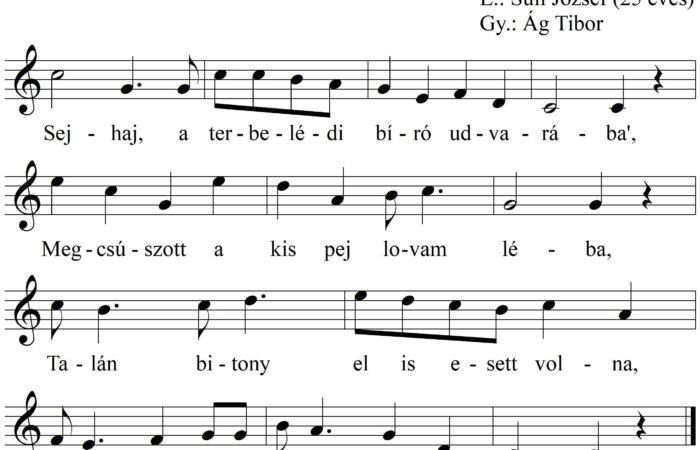1. Sej-haj, a terbelédi bíró udvarába’, Megcsúszott a kis pej lovam lába, Talán bizony el is esett volna, Ha a...