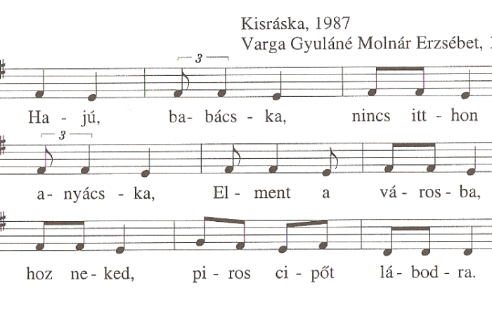 Csicsijja, babájo, nincsen neki anyájo, Elment vásárro, Cipőt venni lábáro, Réklire kapcsot, Ingöcskére gombot, Hő!