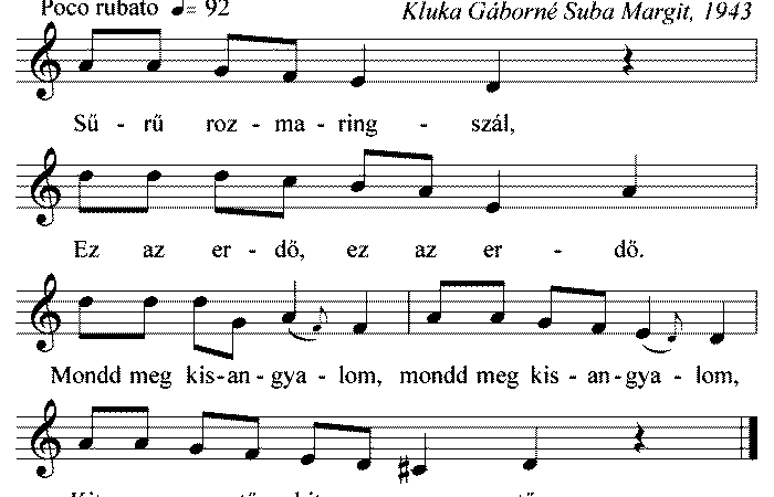 Sűrű rozmaringszál, Ez az erdő, ez az erdő, Mondd meg kisangyalom, mondd meg kisangyalom, Kit szerető, kit szerető. Senkit sem...