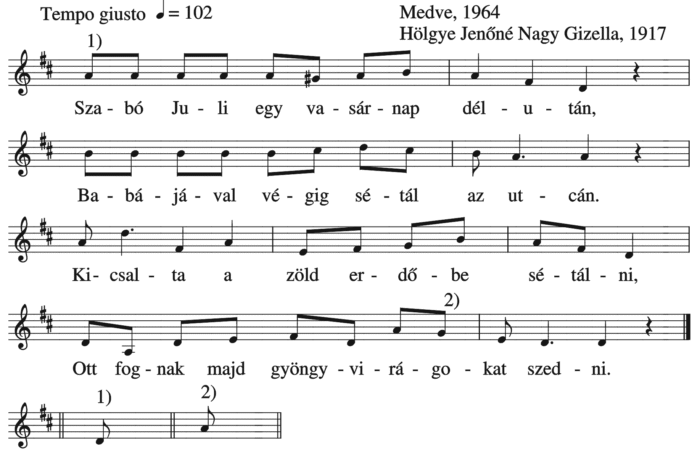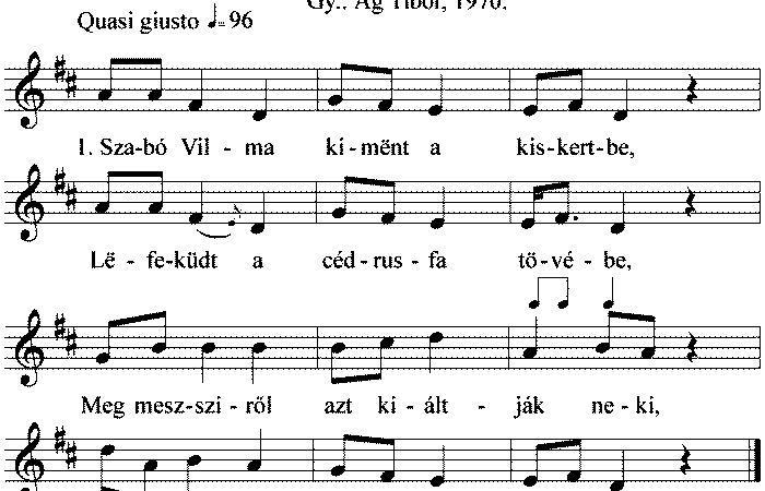 1. Szabó Vilma kimënt a kiskertbe, Lëfeküdt a cédrusfa tövébe. Meg messziről azt kiáltják neki, Kelj föl Vilma, mër mëglát...