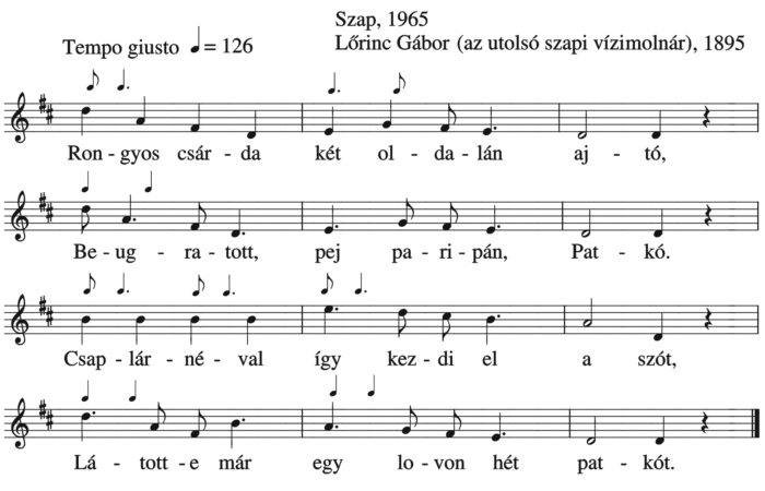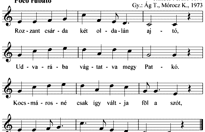 Rongyos csárda két oldalán ajtó, Beugratott pej paripán Patkó. Csaplárnéval így kezdi el a szót, Látott-e már egy lovon hét...