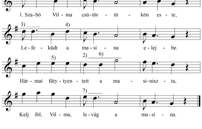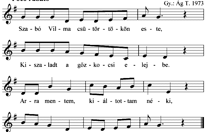 1. Szabó Vilma csütörtökön este, Kiszaladt a gőzkocsi elejbe. Arra mentem kiállottam néki, Vigyázz Vilma, mert meglát valaki. 2. Szabó...