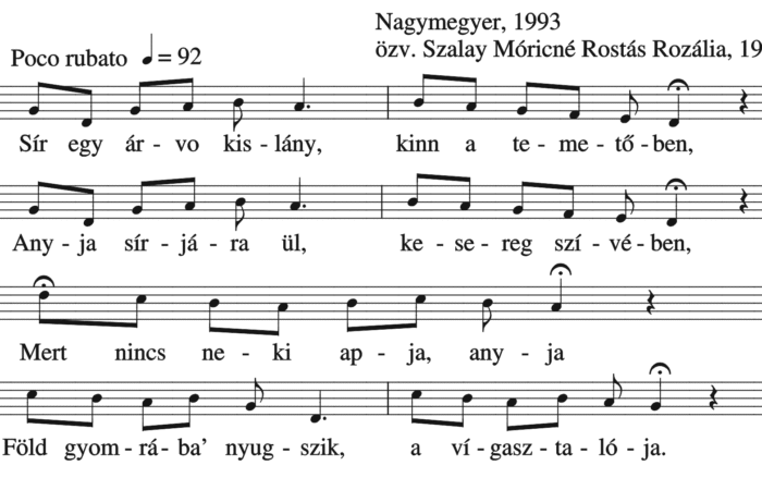 Sír egy árvo kislány kinn a temetőben, Anyja sírjára ül, kesereg szívében. Mert nincs neki apja, anyja, Föld gyomrába’ nyugszik...