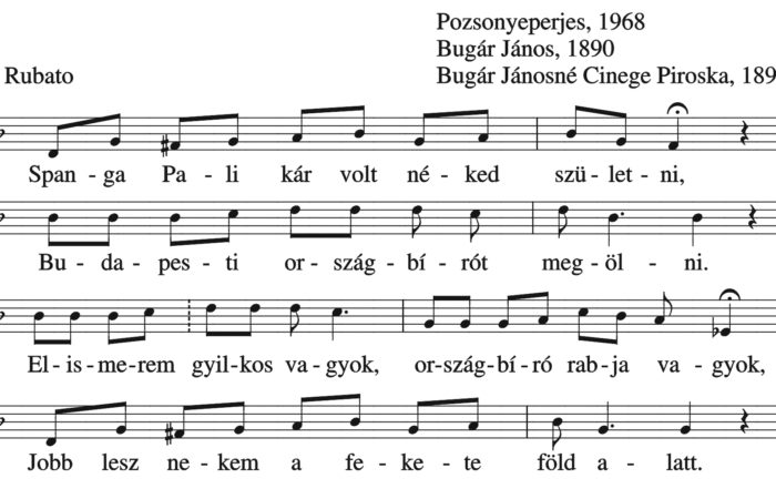 Spanga Pali, kár volt néked születni, Budapesti országbírót megölni. Elismerem, gyilkos vagyok,országbíró rabja vagyok, Jobb lesz nekem a fekete föld...