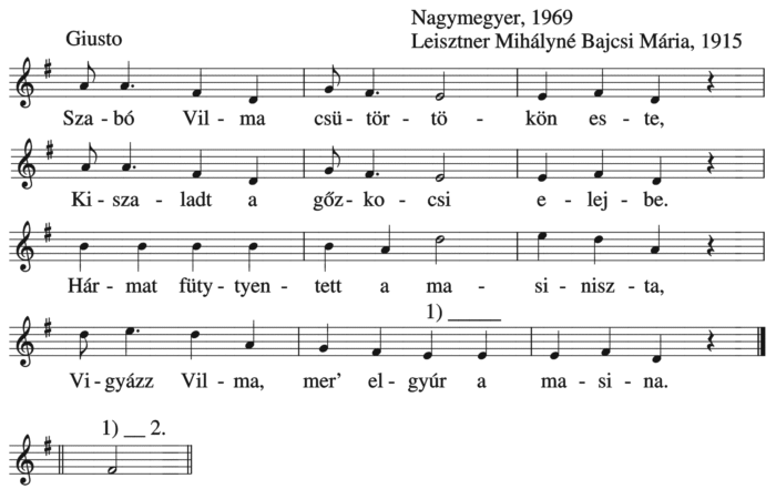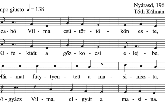 Szabó Vilma csütörökön este, Kiszaladt a gőzkocsi elejbe. Hármat füttyentett a masiniszta, Vigyázz Vilma, mer’ elgyúr a masina. Szabó Vilma...