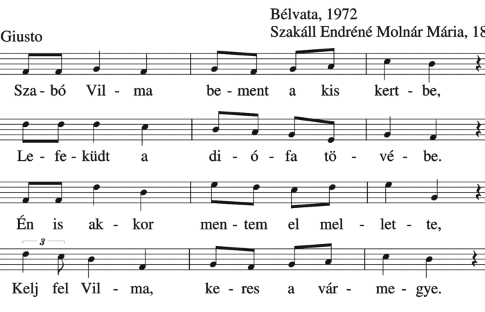Szabó Vilma bement a kiskertbe, Lefeküdt a diófa tövébe. Én is akkor mentem el mellette, Kelj fel Vilma, keres a...