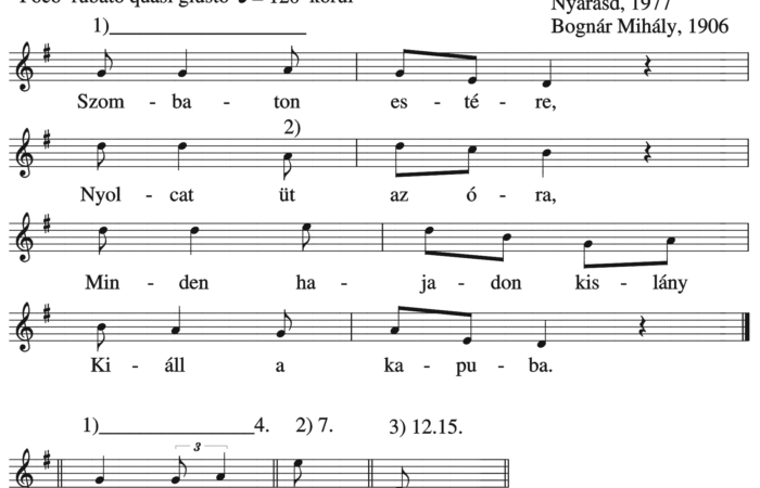 Szombaton estére, Nyolcat üt az óra, Minden hajadon kislány Kiáll a kapuba. Aranyos Mariska, Ő is kiállana, Hogyha a csillagos...