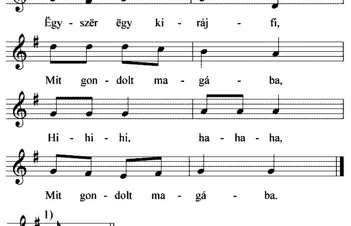 Ëgyszër ëgy kirájfi, Mit gondolt magába, Hihihi, hahaha, Mit gondolt magába. Föl kéne készűni, Kocsisi ruhába, Hihihi, hahaha, Kocsisi ruhába....