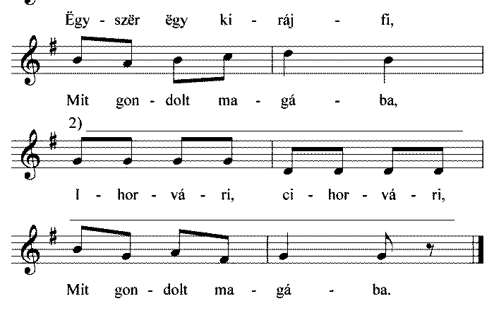 Ëgyszër ëgy kirájfi Mit gondolt magába, Ihorvári, cihorvári, Mit gondolt magába. Felöltözött szépën Kocsisi ruhába, Ihorvári, cihorvári, Kocsisi ruhába. Elmënt...