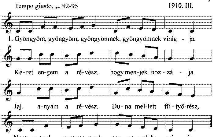 1. Gyöngyöm, gyöngyöm, gyöngyömnek, gyöngyömnek virágja, Kéret engem a révész, hogy menjek hozzája, – Jaj, anyám a révész, Duna mellett...