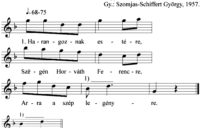 1. Harangoznak estére, Szëgén Horvát Ferencre, Árra a szép legényre. 2. Még csütörtökön délbe Vígan ment a pincébe, Vígan ment...