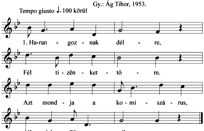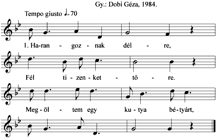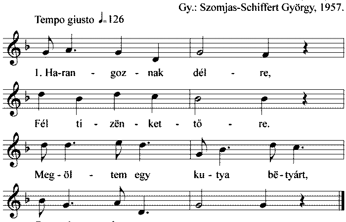 1. Harangoznak délre, Fél tizenkettőre. Megöltem egy kutya bëtyárt, Dunába vëtëttem. 2. Duna bë nem vëtte, Partjára kitëtte. Arra gyütt...