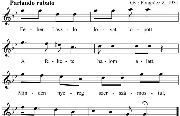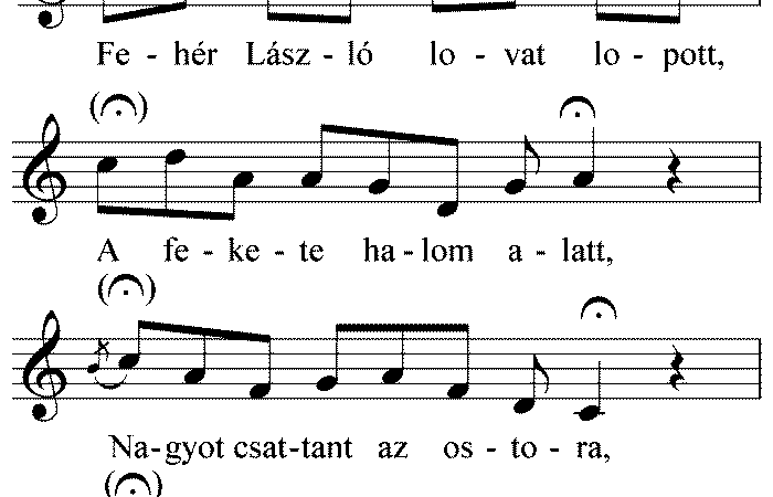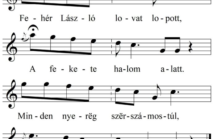 1. Fehér László lovat lopott, A fekete halom alatt, Nagyot csattant az ostora, Belehallatszott Gönc városba. 2. Behallatszott Gönc városba,...
