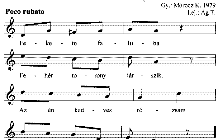 1. Fekete faluba Fehér torony látszik. Az én kedves rózsám Más ölébe játszik. 2. Nincs ott, nincs ott, nincs ott,...