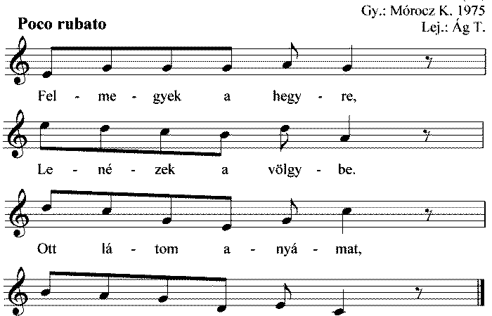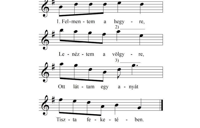 1. Felmegyek a hegyre, Lenézek a völgybe. Ott látom anyámat, Tiszta feketébe. 2. – Jó napot, jó napot, Ismeretlen anyám!...