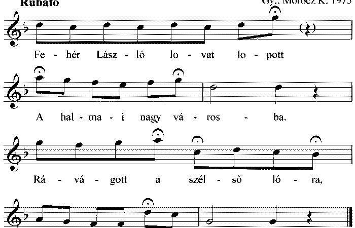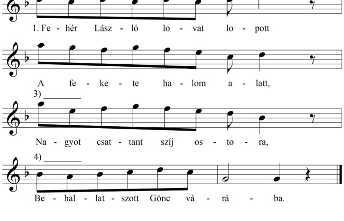 1.Fehér László lovat lopott A halmai nagy városba. Rávágott a szélső lóra, Bevágtatott Gönc városba. 2. Gönc városa rajta, rajta,...