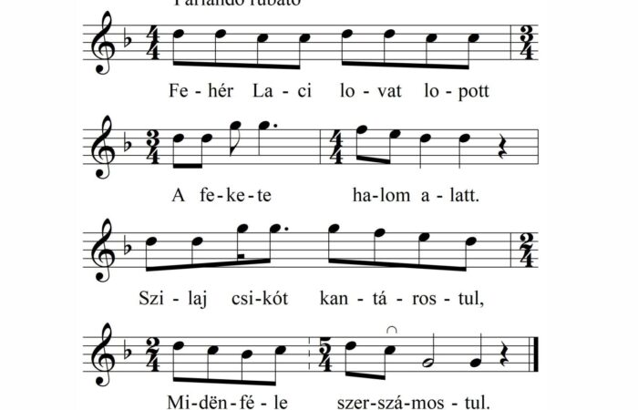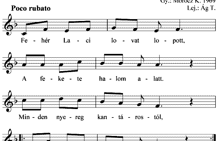1. Fehér Laci lovat lopott, A fekete halom alatt. Minden nyereg kantárostól, Csinos veszély szerszámostól. 2. Azt megtudta Fehér Anna,...