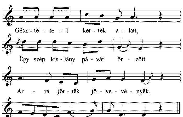 1. Gesztetei kertek mögött, Egy szép kislány pávát őrzött. Arra jöttek jövevények, Három vándorló legények. 2. Hallod-e te szép kislányka,...