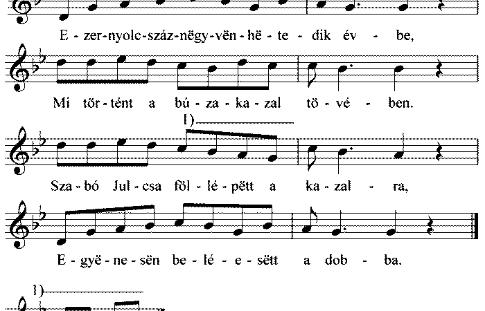 1. Ezernyolcszásznegyvenhetedik évbe, Mi történt a búzakazal tövében. Szabó Julcsa föllépëtt a kazalra, Egyënesën beléesëtt a dobba. 2. Mikor ezt...