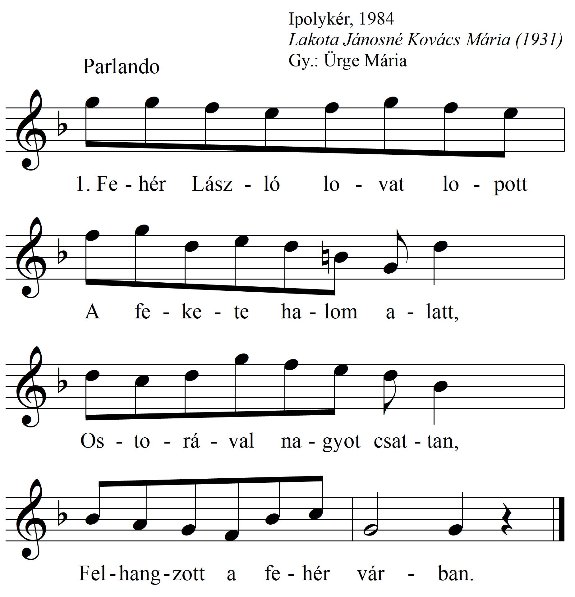 1. Fehér László lovat lopott A Fekete halom alatt, Nagyot csattant szíj ostora, Behallattszott Gönc várába. 2. Gönc városa rajta, rajta,...